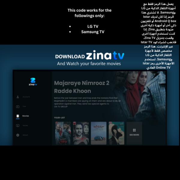 يعمل هذا الرمز فقط مع أجهزة التلفاز الذكية من LG وSamsung. لا تشتري هذا الرمز إذا كان لديك Istar Android Q box أو تلفزيون ذكي آخر أو أجهزة ذكية أخرى مزودة بتطبيق Zina. إذا كنت تستخدم أجهزة أخرى وقمت بتنزيل Zina TV، فاذهب لشراء كود Istar TV عبر الإنترنت. هذا الرمز مخصص فقط لأجهزة التلفاز الذكية من LG وSamsung. تستخدم الأجهزة الأخرى رمز Istar Online TV العادي